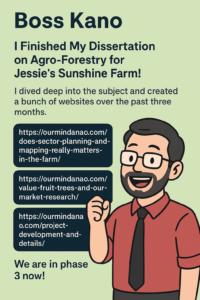 After months of deep research, field thinking, number crunching, tree spacing debates, and conversations that started with “what if…”, “maybe like…” I officially finished my agro-forestry dissertation for Jessie’s Sunshine Farm. This wasn’t theory for theory’s sake. This was a ground-level, boots-in-the-mud, will-this-tree-compete-with-that-tree kind of study.