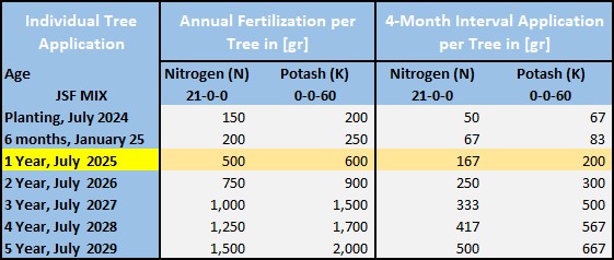 The Whole Farm Mixture is for 800 trees of Jessie’s Sunshine Farm. We pick the year in the left column and we can read in the next column to the right, how much 21-0-0 and 0-0-60 in kg, we will have to mix. But since we cannot buy half or quarter sacks, we have to procure rounded up or down quantities. This means under Procurement you will see how many sacks to buy for each of our 3 times (every 4 months) of fertilization per year. Therefore, we still have to mix the recommended kg in the first columns. We consider all trees now one year old, as of July 2025.