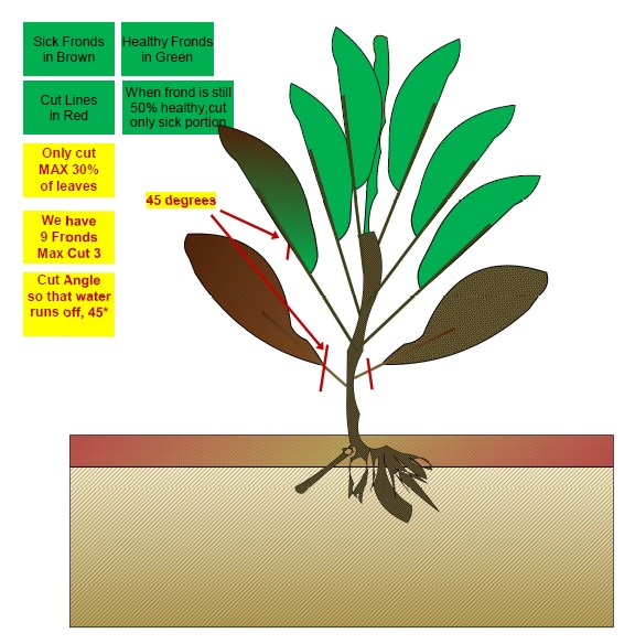 - Dispose of Removed Fronds Safely. Dispose of the removed fronds from the trees properly as they can harbor pests or disease. Do not compost if they are diseased; instead, pile them in one area and we burn them later.