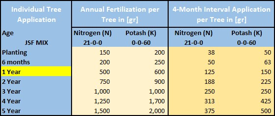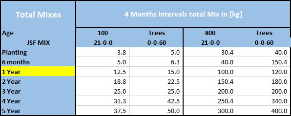 This mixture is for a whole bunch of trees. You will find the right volume by multiplying and adding the table values. I.e., if you want to mix for 400 trees, you simply multiply the mix for 100 trees by 4 of the same year. Usually if me fertilize all 800, just look up the table. We consider all trees now one year old.