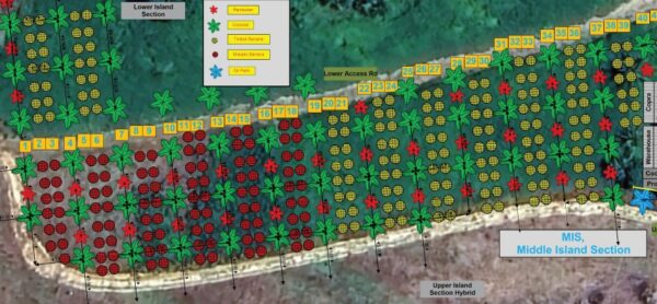 Each row has a label for identification containing a sector name and a row number. All trees are counted outwards from the label. Hence LHS Row 4 CNT 2, translates into Lower Hybrid Section, row 4, Coconut tree #2. In this way trees that need treatment can be identified easily.