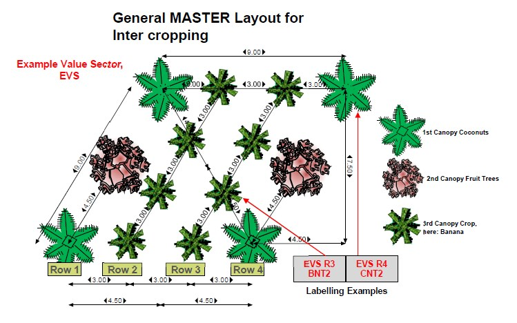 Here is the general layout for planting on Jessie’s Sunshine Farm. Big fruit trees go inline with coconut trees. 1st and 2nd canopy. Then two lines, 3 meters apart, with planted crops that do not need more space than 3 meters, as the 3rd canopy.