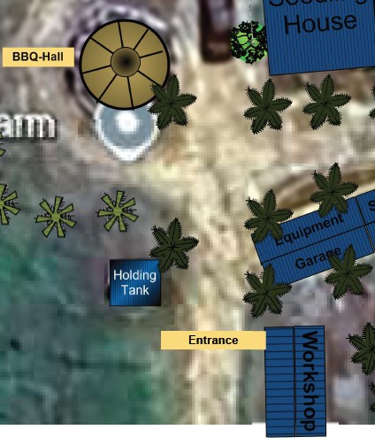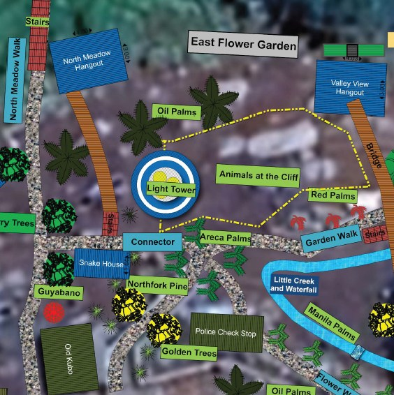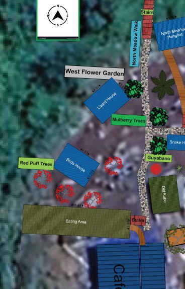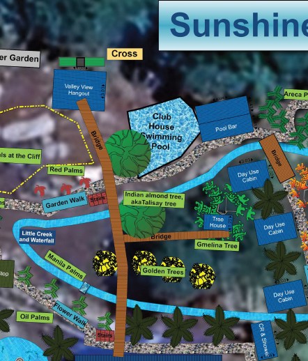 Sunshine Village is a beautifully landscaped tropical resort/garden estate, a resting place in mitten of a operating farm plantation. The Garden is being built around an artificial winding creek (“Little Creek and Waterfall”) that flows from the northeast of the Function Hall down to the cliff edge. The entire Central Area of Jessie’s Sunshine Farm is designed as a walkable garden paradise with multiple themed walking paths, flower gardens, palm groves, colorful flowering trees, and scenic bridges.