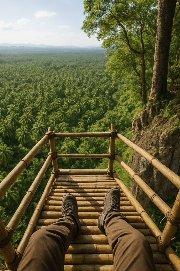 Butterflies and birds are attracted to the diverse flowering plants, and the “Animals at the Cliff” spot adds a touch of wild nature. Hence you follow the path to the left of the old Kubo and you will enter the West Flower Garden. Here we have Red Puff Trees, plus another hang out at the windy cliff, viewing the goats while they are sun bathing on sandstone boulders, some Oil Palms, Guyabano Trees. Children will sprint toward the animals at the Cliff, the open-hearted Filipino mini-zoo of two or three small habitation facilities. Here, hornbills flash emerald and gold, monitor lizards bask like ancient guardians, and small macaques swing between branches, chattering gossip only kids seem to understand. Their parents drift to the Day-Use Cabins (simple, breezy nipa salas right over the water), ordering or bringing platters of inihaw na bangus, ensaladang pako, sizzling sisig, and buko straight from the Cafe. Plates pass from hand to hand, stories grow louder, and nobody ever checks the time.